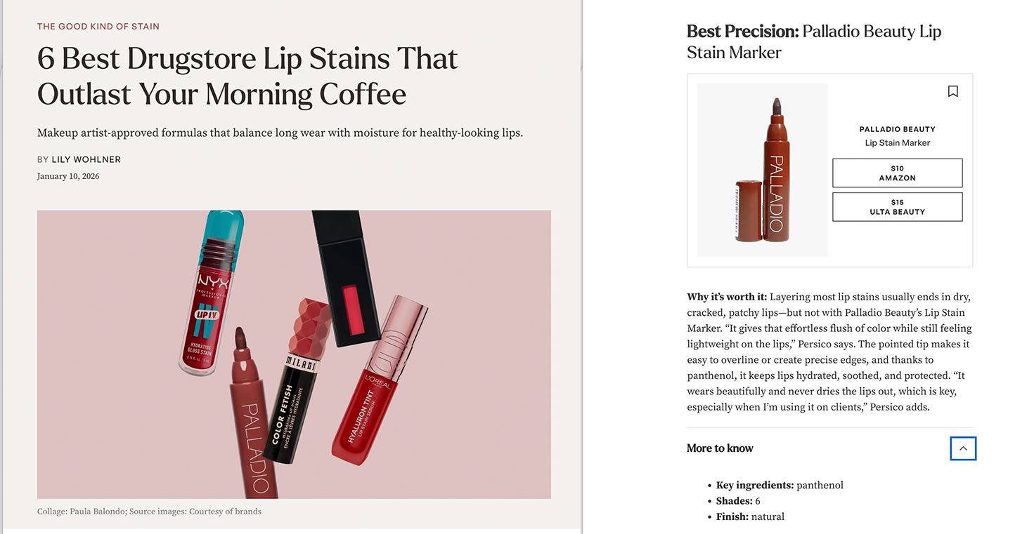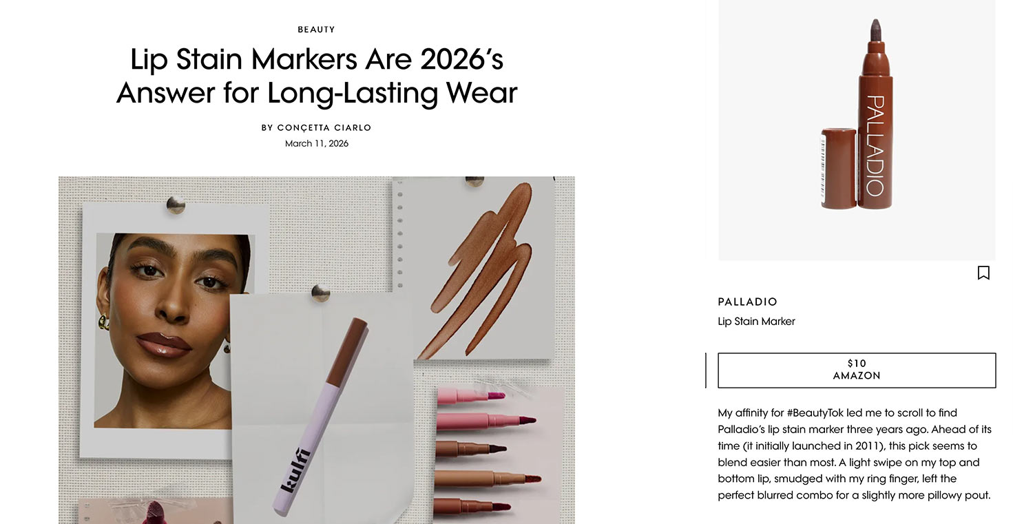 - “The Best Lip Stains for Transfer-Proof, Long-Lasting Color” featuring the Palladio Lip Stain Marker
