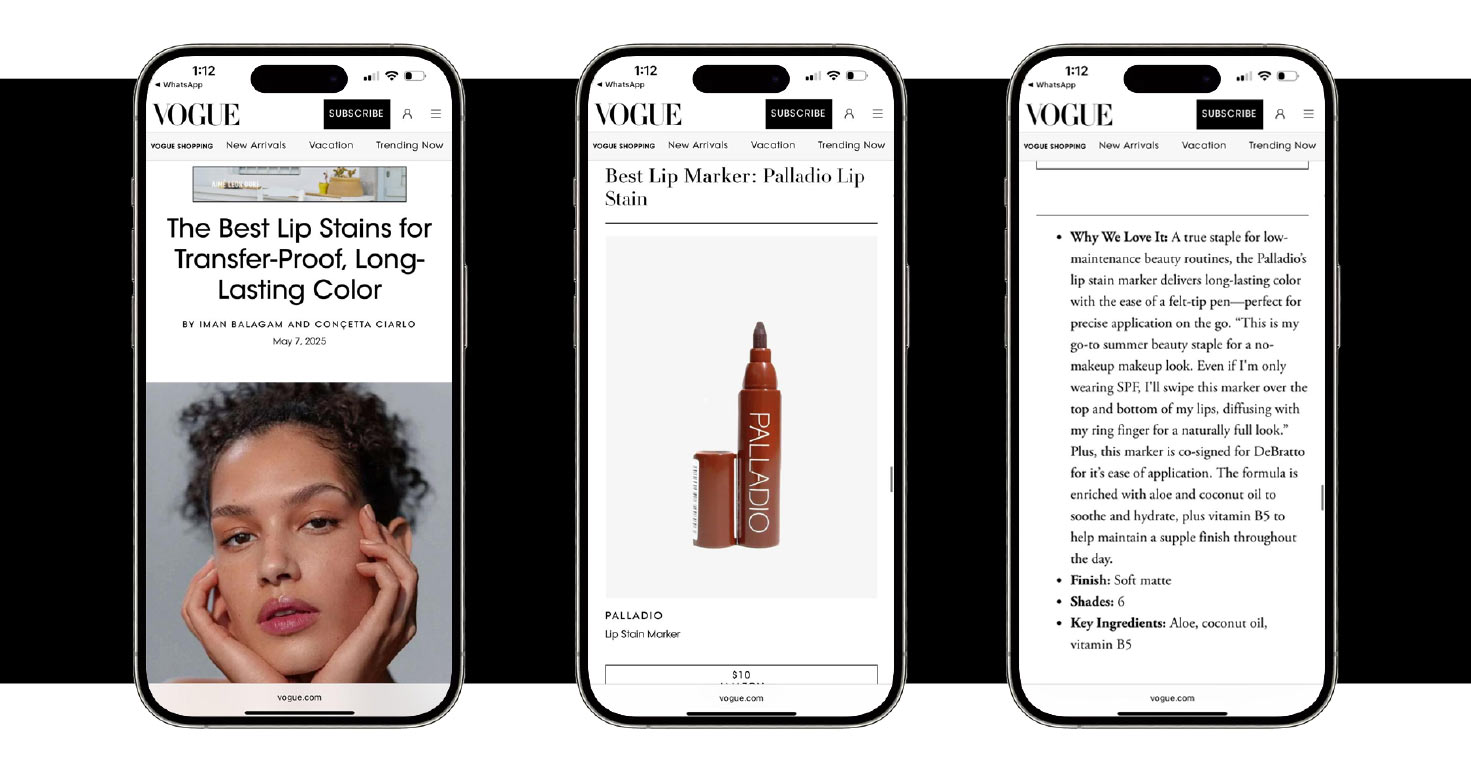 Palladio has been featured multiple times across Vogue, reinforcing its position as a go-to for accessible, high-performance beauty.