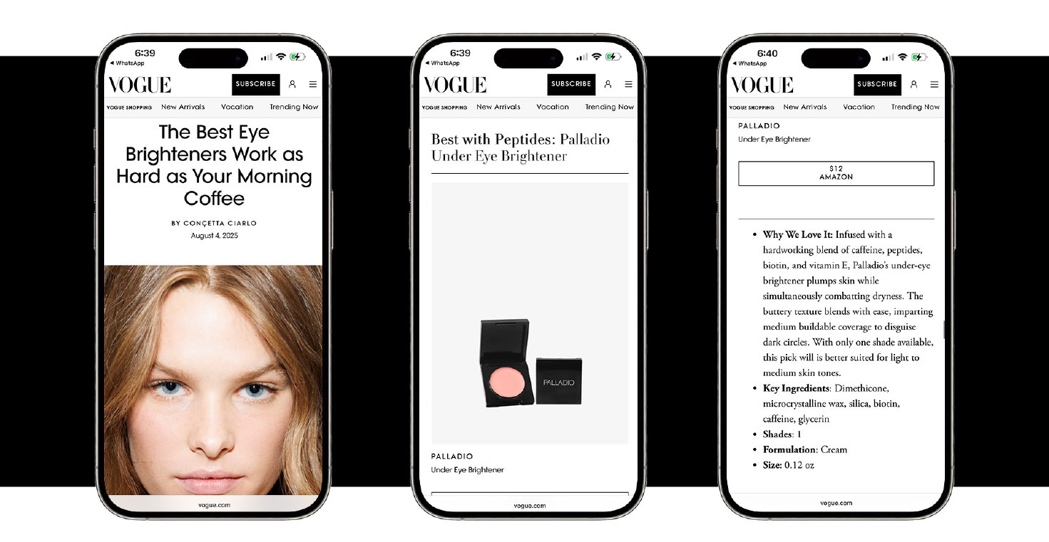 Palladio Beauty continues to gain recognition across leading media platforms, with recent features spanning Vogue, Billboard, and other top-tier publications. These placements highlight the brand’s growing relevance across editorial, celebrity, and digital-first beauty conversations.